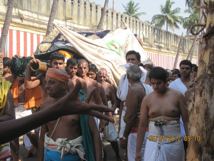 The old women felt sad that had she known that the Lord would come to eat, she would have made akkarai vadisal ( sweet pudding with dry fruits ) and fed the Lord . Out of abundant mercy , Lord appeared before her and told her that He always eats akkarai vadisal at His palace of Srirangam but was longing for the simple food that His devotees have been eating. To enact this incident , every year the Lord sets off to Jeeyarpuram and blesses His devotees there. The Lord accepts offerings on the way towards Jeeyarpuram and reaches Jeeyarpuram Astana Mamandapam around 11 AM the next day. This festival is enacted on the second day, NamPerumal starts on a procession around the Chithra streets at 7:30 AM and arrives at the Garuda Mandapam through Ranga Vilas. He remains at the Garuda Mandapam till the evening blessing all his devotees with His darshan. At 5:15 PM, NamPerumal starts His procession graciously marching towards JeeyaPuram, which is located west of Srirangam across the Vada Thiru Cauveri along the Melur Road. This day signifies His graciousness to go to His devotees who are unable to come to Him and provide His blessings to all. The main purpose of Him to go to Jeeyar Puram is to provide His blessings to his beloved devotees outside of Srirangam as well.