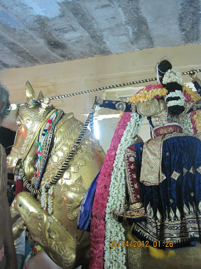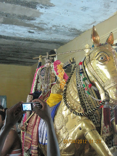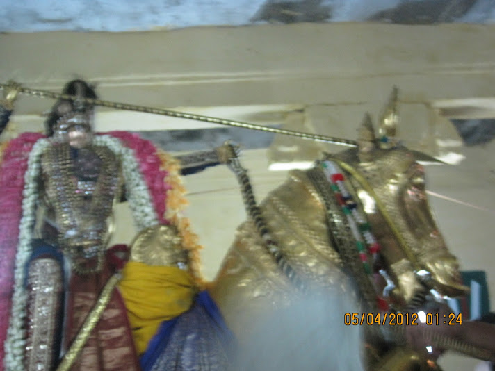 Thirumangai Azhwar another name was Kaliyan who was the valiant army chief of the then Chola King . The king gifted him with a small territory to rule over. Hence, he was known as Thirumangai Mannan . He was attracted to an apsara Kumudavalli , daughter of a physician and expressed his desire to marry her. Kumudavalli who appeared on this earth to transform this valiant king to a bhakta, laid the condition that he should feed 1000 Srivaishnavas every day for one year . Thirumangai Mannan fulfilled her condition and continued to do so even after his marriage as he got habituated in this wonderful kainkaryam of feeding Srivaishnavas. In due course, his wealth diminished and as Lord Krishna says in Bhagavad Gita, when HE decides to bless HIS devotee, HE takes away wealth and enacted a divya leela. Due to his love for vaishnavas , our Azhwar resorted to stealing and plundering wealth from the rich and the egoistic and used the wealth for feeding Vaishnavas and renovating temples. Tirumangai Mannan comes to know through his friends that a newly wedded couple bedecked with costly jewellery are passing through a forest in a palanquin and if they could plunder their wealth, they could continue with their cause of serving Srivaishnavas forever. So, Thirumangai Mannan along with his four friends leaves his place in the midnight , rides fast on his horse,who he calls as Aadalmaa, waylays the divine couple who are resting in a mandapam at “Thirumanankollai” and plunders their wealth and ties them in a cloth. Not being satisfied with the loot, he tries to remove the Thirumetti of Thayar with all his might and is unsuccessful. By coming in contact with Thayar’s thiruvadi, realisation dawns on him. When he tries to lift the loot, he is unable to do so and suspecting the bridegroom for having put some charm , he threatens Perumal who is disguised as the bridegroom with a sword to disclose the secret.that does not allow him to carry the loot Perumal advises him to purify himself and return so that he can impart the secret to him. Thirumangai mannan returns and Perumal gives him the most sacred mantram,Thirumantram . The moment Perumal whispers the sacred Ashtakshari Thirumantram , wisdom dawns on Kaliyan and he surrenders at the Lotus feet of the Divya Dampadhigal. He repents for all his earlier deeds and outbursts his pourings starting with “Vaadinene Vaadi….” and decides to glorify Perumal by visiting holy places in India.. He is transformed as Thirumangai Azhwar and riding on his Aadalma horse glorified Perumal in about 86 divya desams. Every year, this incident in recollected on Panguni-Makham (Mar-april) at thirunangoor as Thiruvedupari utsavam and this year the incident is enacted on 2nd midnight April 2015 . The pics were taken during our last visit . We participated in the Thirukalyanam of Perumal with Nachiyar the previous afternoon . Later , in the night after saatrumarai, the newly wed Perumal and Thayar bedecked fully with jewellery set out on a decorated palanquin. WE were told that they would halt in a mandapam at Thirumanankollai. We drove to Thiruvali-Thirunagari temple to have darsanam of Thirumangai Azhwar also known as Kaliyan/Neelan/Thirumangai Mannan and were among the crowd awaiting the temple doors to open….Now the most beautiful THIRUVEDUPARI UTSAVAM begins ..