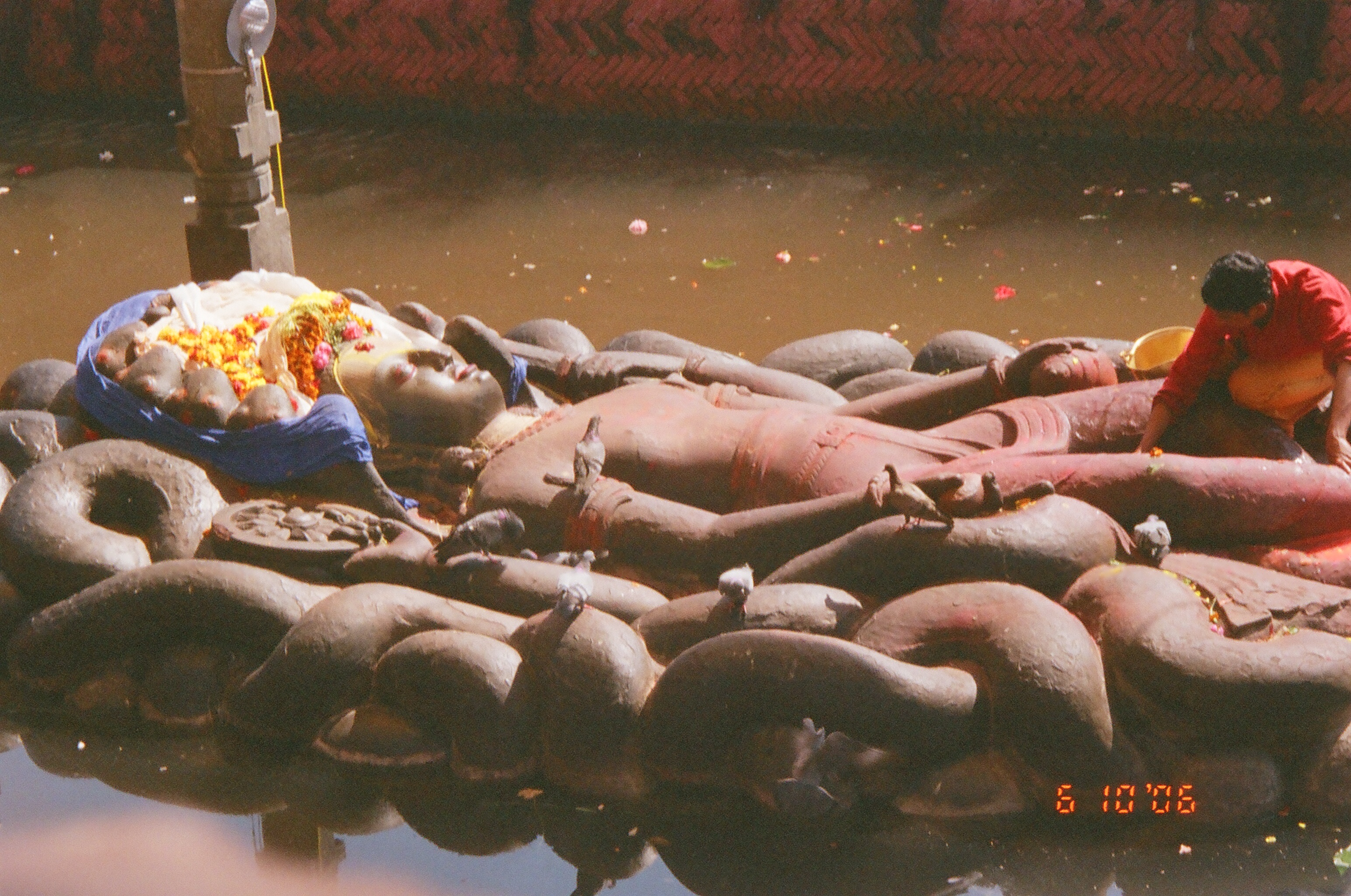 Offering humble prayers seeking a wonderful  darshan and satsangh at Mukthinath  we proceeded to Buddhanilkantha temple  which is 9 km from Kathmandu city. The temple consists of a pond in which lies a diety  of Lord Vishnu reclining on the coils of a cosmic serpent. The huge deity  of sleeping Vishnu lying on Ananta Sesa, in the cosmic ocean is very attractive . The Deity is over 1,000 years old. Lord Vishnu is about 5m (17 ft) and is lying in a 13m (43 ft) long tank, as if floating, with His legs crossed. His four hands hold the four symbols of Vishnu: the chakra (disc), club, and conch-shell and lotus flower. Budhanilkantha literally means “old blue-throat.”