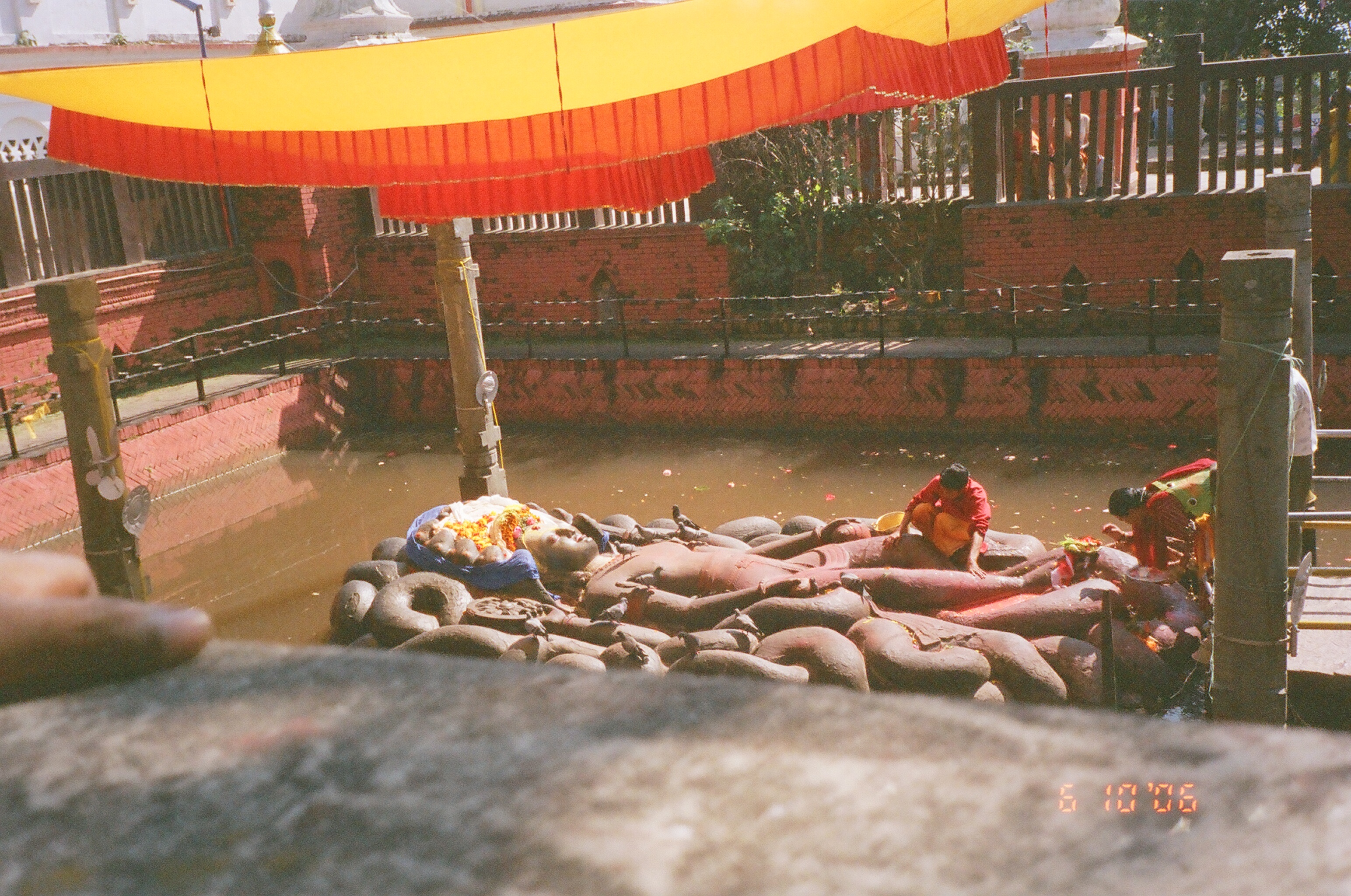 The cost for the same is Rs.3,500/- for 4 PAX which is not  really much worth . However, having paid, we went to view Tharu Cultural Programme organized by the local tribes, The next day we left early in the morning  in a  open top gypsy accompanied by 2 guides and a driver deep into the forest, though we could not spot any rare animal except deers and monkeys , we happened  to see  crocodile breeding centres, and also saw a man-eating tiger which was in a cage.  Not preparing  for further exploitation,  except surrendering to our  LORD ,we left for Katmandu, which was another 5 hours drive. reached Katmandu at 7P.M. shiva-pashupatinath-templeKathmandu, the capital of Nepal, is also called as Kantipur. Kathmandu is full of temples. It lies in a valley surrounded by high hills. Magnificent snow peaks are visible in the north. This city is situated to the north of Patan and the west of Bhaktapur. The altitude of Kathmandu is 4500 ft from sea level .Though we  had intended to stay in ISKCON guest house at Katmandu but as there was no accommodation, we were forced to check in Hotel Taj (as recommended by the travel agent) and retired for the night. On 5th, we went for local sight seeing in Katmandu.  And covered various temples including the famous Pashupathinath temple. The temple of ParamaShivan one of the Jyothir Linga  is situated at the bank of the sacred Bagmati river. It is 5 Kilometers for east from the Kathmandu city. This pagoda style temple built with golden roofs and silver doors is where thousands of devotees come to pay homage to God Pashupati Nath. Shivaratri is the holy day of religious festival of Hindu people. Pashupati Nath ia the patron deity of Nepal. It was noon and midday abhishekam was going on.  Lord Shiva’s face with matted locks and Ganges escaping from the locks is beautifully carved on all five sides of the deity .  The  main sanctorum  (garbagriham) has doors on all four sides which enables the devotees to have darshan from all the four sides.