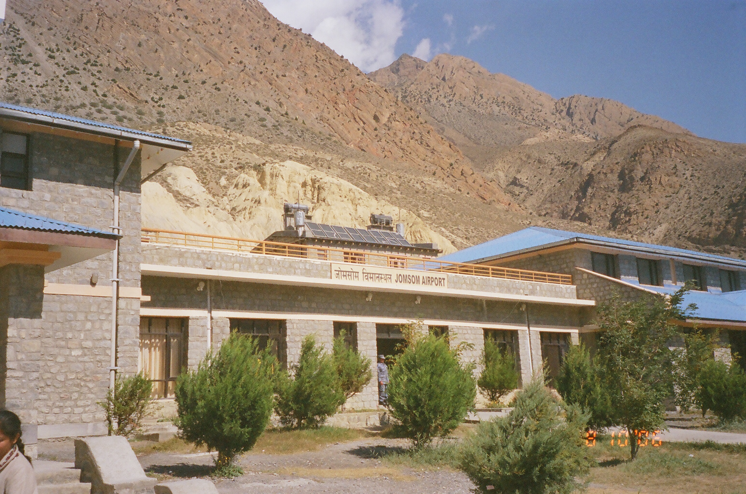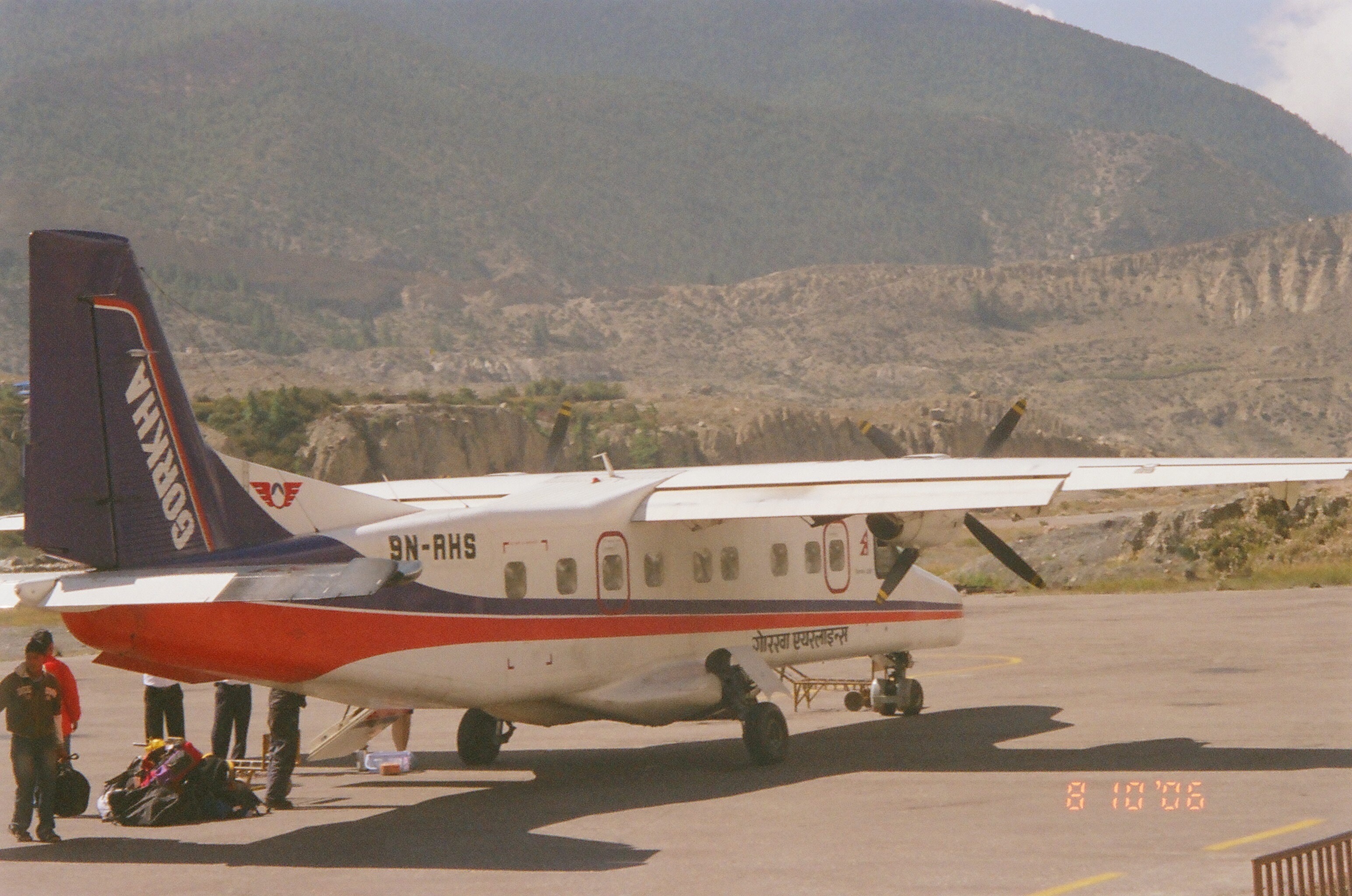 On the right of the aircraft I can see the white Himalayas, which stand like a great wall between Nepal and China. On the left are high mountains, but no snow. Below us are valleys and a holy river. The weather is good. It is clear. We can even feel some heat on my feet. The plane flies between the Himalayas, not over them! The flight takes only 20 minutes but seems a lot longer. We are in this  little Dornier aircraft, skims craggy ridge tops and is often buffeted by mountain winds. Chanting Lords name continuously I slowly dare to see the propellers from the window panes ..When an airplane flies to Jomsom they are very close to the mountains on either side of the valley. Strong winds come off the mountains at times, making it difficult or impossible to fly. A few years ago a flight crashed into the side of one of the mountains and it took them several days to find it. There were no survivors.