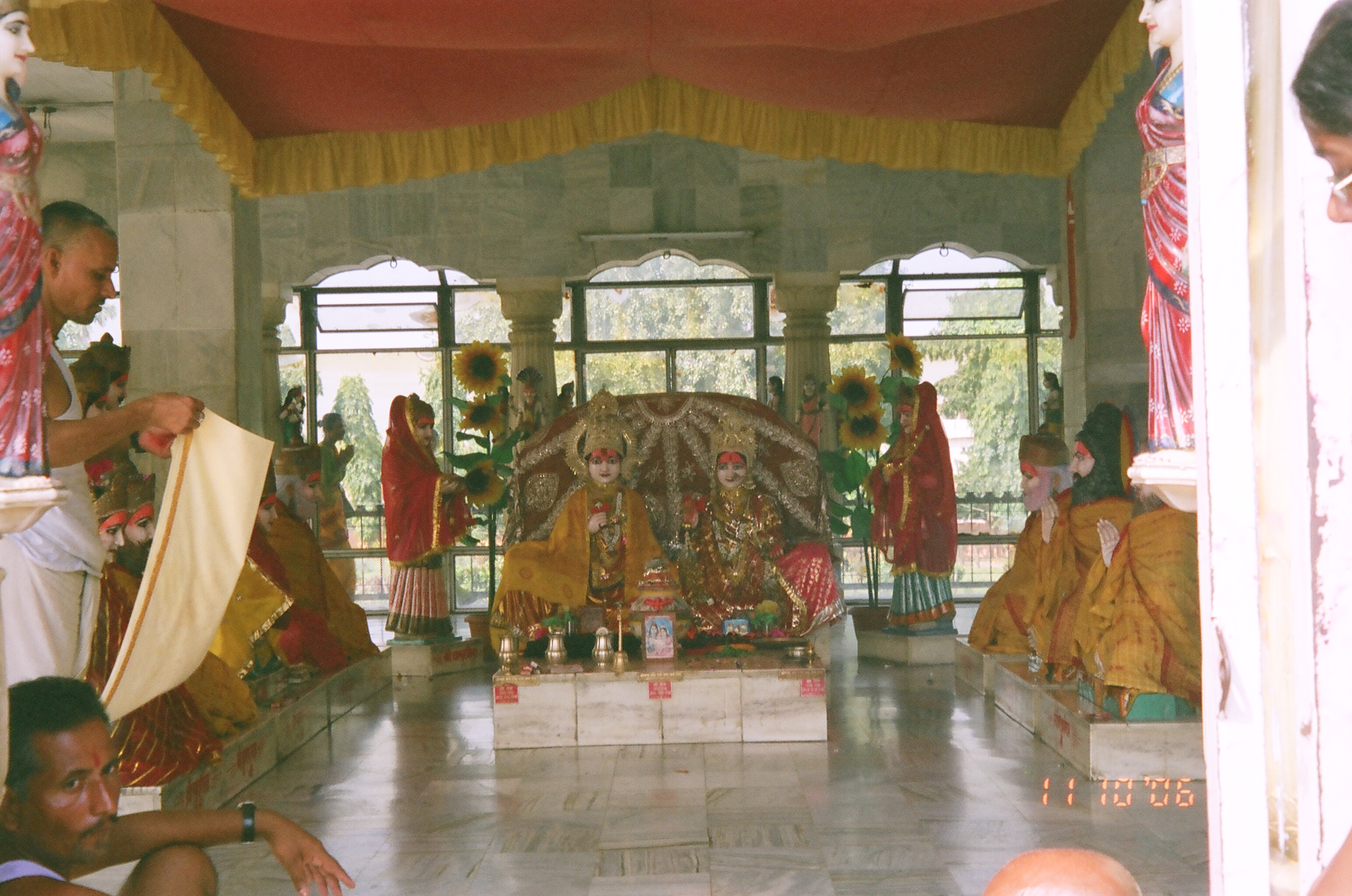 In the  sanctum sanctorum, Lord Rama, Sita Devi and King Janaka are seen.  During aarthi, prayers on  Sita Devi were sung. Apart from this, the palace houses other shrines too.  In one of the shrines, we could find full family of Janaka – Lord Rama –Sita, Lakshmana-Urmila, Bharata, Shatruguna –Srutikeerthi, King Janaka, his brother, his queen .  Apart from this, this shrine houses 3,000 saaligramama silas which were covered by a satin  cloth. We proceeded to Sita Rama Kalyana Mantapam which is situated just outside the palace on the left side. Rs.5/- is charged as  entrance fee . A big mantapam in the centre with life –size images . Lord Rama, and  Sita in Kalyana Thirukolam in sitting posture,Lakshmana, Bharata and Shatruguna also in Kalyana Thirukolam, King Janaka and his brother in standing posture, Dasaratha,his queens, Sage  Vasishta and other rishi in sitting postures, Brahma, Shiva and other devas blessing. The sight was a real feast to the eyes.  Around the mantapam, on 4 sides, there are 4 sannidhis for all the 4 brothers with their wives.