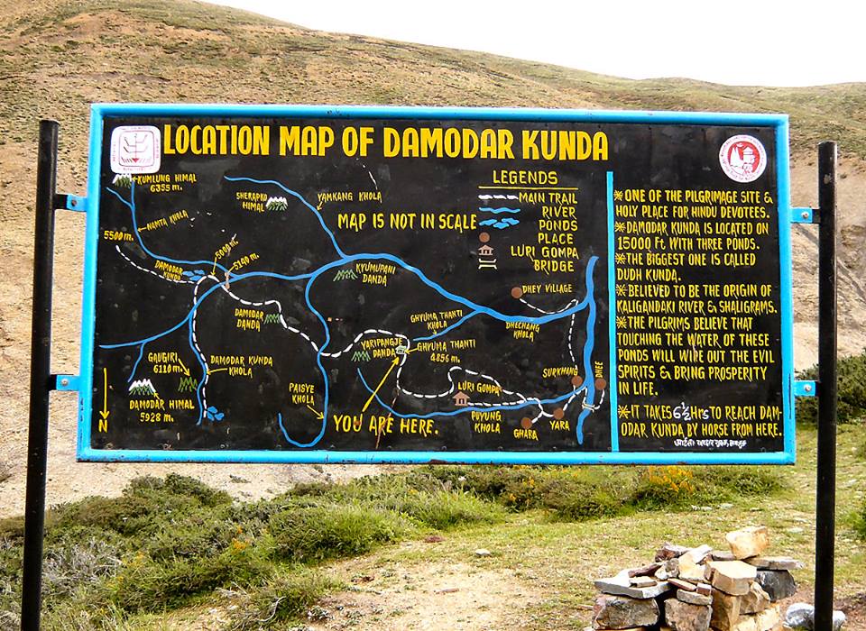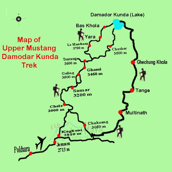 We are now in the Lower Mustang belt as per the Map . Mustang is an Anglicization of the Tibetan Lo Manthang, which is an autonomous region in north-central Nepal that borders on Tibet. The destination of our trek today was to reach Mukthinath by evening  . En route there is the village of Kagbeni (“Crow Confluence” in Nepali). The rocky highland stretching from Jomsom to Kagbeni–through which the Gandaki flows–is called Lower Mustang. Upper Mustang is where Damodar Kund is located, a lake that is the root source of all salagram silas.  It was told that from here one treks to Damodar kund the source of all the saligrama silas ( Sree Moorthy ) According to one version, the Salagramam Divya Desam is just the bank/bed of River Gandaki and not the Mukthinath temple. Few also claim Its Damodar kund .River Kaligandaki has its source in Damodar Kund and throughout its flow to south right up to Indian border carries a manifestation of lying lord Vishnu with Damodarkund jeweled as His auspicious Head and with Muktinath as the mouth, Shaligram Chakra as chest Kuru Kshetra as the waist, Devaghatam as the Knee and lastly the auspicious feet of lord Vishnu goes to the credit of Gajendra Moksha devadham,. Such a beautiful elaboration of the lord, one may find starting from the auspicious lakes of Damodar Kund. The Damodar Kunda (lake) is situated rain shadow of High Himalayas north of Annapurna range. The elevation of the Damodar Kunda is 4890 meters and it is a cold and windy place. According to another version, the Mukthinath temple is very much the Divya Desam of Salagramam. It is difficult to establish which of the two versions is right. Either way, there is no question that our  great  saint Thirumangai Azhwar visited at least the banks of the Gandaki River, as did Swamy Ramanuja. And no matter which version is accurate, there is no taking away from the beauty of this Divya Desam and its surroundings. and one of the pAsuram, Tirumangai AzhwAr exhorts his mind to attain the Lord of Salagrama. It was this Lord who, armed with bow and arrow, crossed forests inhabited by wild deer, elephants and horses, and then built a bridge of boulders to reach the high-walled fortress of Lanka and severed the ten heads of Ravana- the king of the RakshasAs glorifying LORD RAMAs avataram . The route to Damodar lake is three days walk north east from the main Mustang trekking route & very close to Tibetan border.