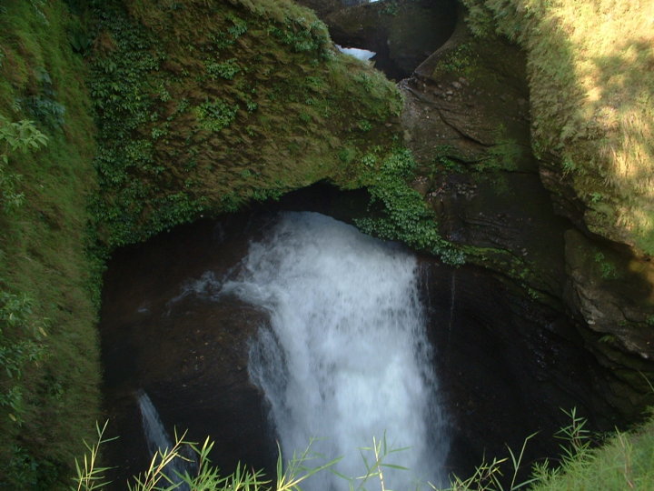 First, we visited Gupteshwar temple, which is in  a natural cave descending around 100 steps, shrine dedicated to ParamaShiva .  A sage by name, Gupteshwar did penance at this place and had darshan of Lord Shiva, the presiding diety of Nepal.  The rocks have taken the shape of a huge snake and it looks as if the snake is protecting the deity.  This natural formation is admirable.  The entry fee for Indians is Rs.20/- and for Nepalese , it is FREE.  Few saaligrama shilas were also placed near the shivalingam.  It may be noted that saaligramams are available  everywhere in Nepal.  From there, we proceeded to DEVI’S FALLS on the other side of the road.