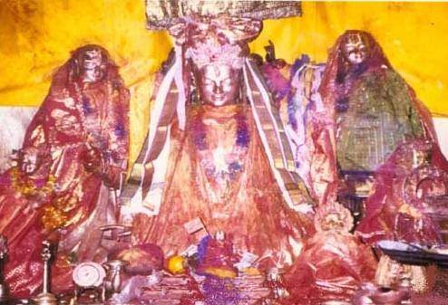 The deity at Muktinath has a large brass kavach ( armour) with a very transcendental smile. On His left and right are Bhu and Sri, two  divine energies of the Lord manifested in their female forms Though in the divya desa naamavali, Perumal is known as “SRIDEVI NAYIKA SAMETHA SRI SRIMOORTHI”, we found ubhaya naachiyaars, Sridevi and Bhoodevi Thayar on either sides of Perumal flanking Him. Perumal is seen in sitting posture while Ubhaya Naachiyars are in Nindra Thirukolam. As it is often mentioned  that Adisesha always performs various kainkaryams to Perumal, here Adisesha is seen spreading hoods like an umbrella.