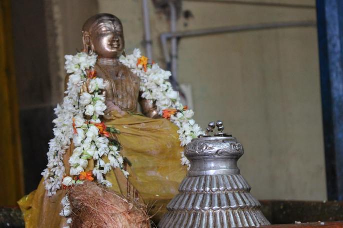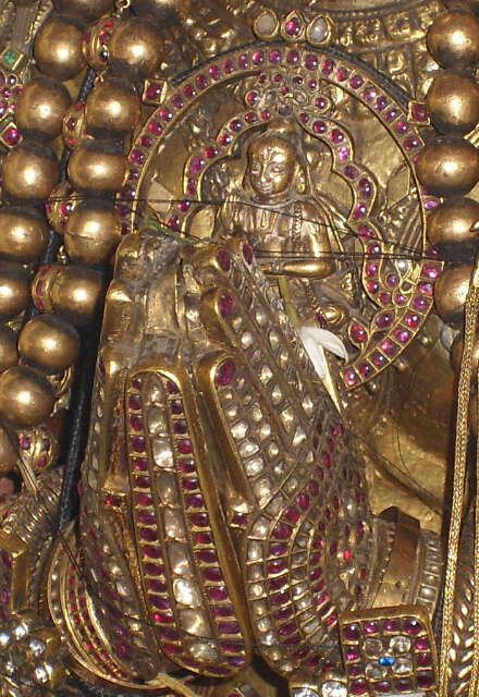 Azhwan sent his disciples to find out where from they could get money for this noble cause. One of the disciples came and told him that there was a gold Buddha statue in a Buddha Vihar at Nagapattinam near Kanyakumari and if they could get it, they could sell the statue and get money for the construction work. But the statue was installed on top of the Vimanam and if the statue was removed the Vimanam would get damaged. Hence they had to find out a way to remove it without damaging the vimanam. But for that they had to find out the sculptor who constructed it. Azhwar sent his disciples to find out where the sculptor lived . Later locating the place , he went in person with his disciples and stayed with a person living opposite to the sculptor. He told that person that he was going on Yathra visiting places and just waiting for the arrival of a ship to continue his yathra to Nagapattinam. One day he was talking to his disciples in a raised voice and was telling them that he came to know that the golden Buddha statue was stolen. The sculptor who heard this was shocked and started cursing the helper who worked with him and knew the secret of the construction of the Statue. Thirumangai Azwar asked the sculptor where the helper lived and that he would go and search for him and punish him for his misdeed. He told Azwar that he did not know his where about but he was from Choza Nadu. Azhwar spoke to him pleasingly and requested him to tell him about the ( Vimana Makuta suthram)construction secret. He assured him that he would find the sculptor and recover the statue from him. The same day a ship arrived and the Azhwar boarded the ship with his disciples. Azhwar went to the Buddha Vihar with one of his disciples and was hiding there till night fall. As he had already took clues from the sculpture to remove the golden statue without damaging the Vimanam, with his disciple’s help he removed the statue. The statue was glittering in the moonlight and Azhwar was just thinking, Buddha who renounced his princely home and kingdom did not deserve a golden statue. On reciting a pasurem the gold from the statue melted and dropped into Azwar’s lap.