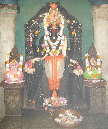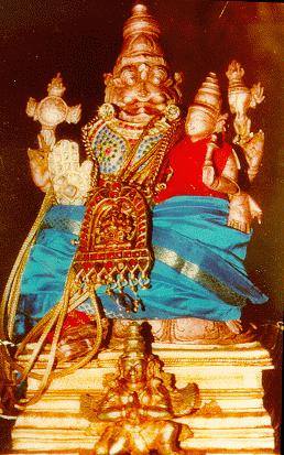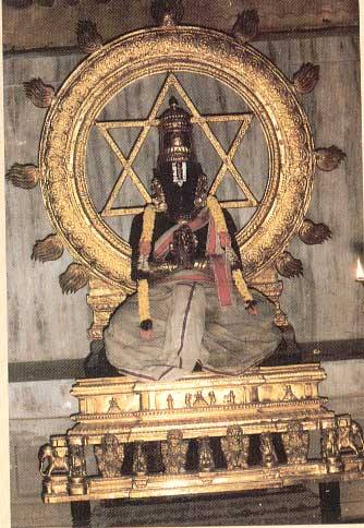 Due to this, there is no abhishekam (ritual bathing) for the Lord at this Temple. The main deity here has a very serene expression on his divine face, which gets accentuated in the light of the ghee lamps. The right hand of the Lord is held is a yoga mudra, while the left hangs down freely.