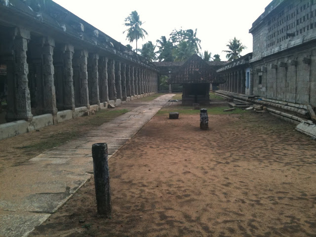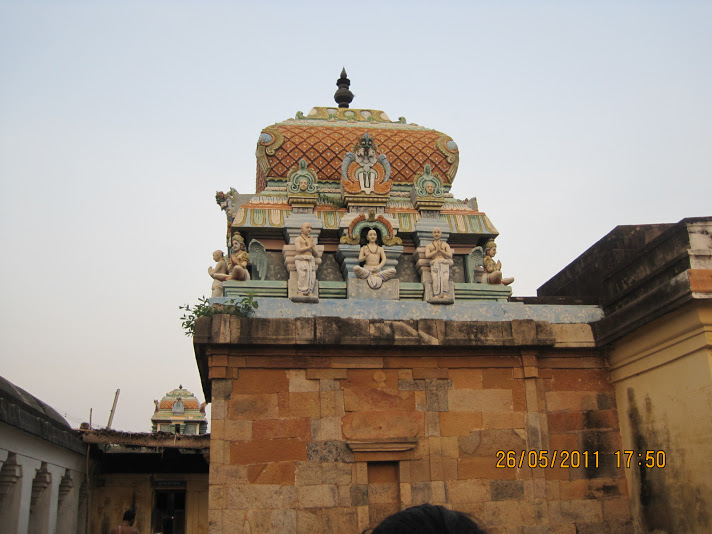 Immediately he told his disiple that he did not want both of them to be seen together and told him to go back to Srirangam and he would follow suit. He decided to walk back to Srirangam. When he was approaching Thirukkannangkudi it was getting dark. He was also feeling tired and so wanted to take rest. Seeing a big tamarind tree, he sat underneath the tree. Beside the tree he saw a wet ploughed field. He digged the muddy field and buried the gold. Then he took rest under the tamarind tree. He was afraid that he might fall asleep and some one might take the gold. He told the tree, even if he fell asleep, the tree should be awake and take care of the gold. Next morning the tamarind tree woke him up by shedding its leaves upon him. He thanked the tamarind tree and blessed the tree as URangaa puLI. It is believed that the leaves of the tree never closed after this incident. The owner of the field came to plough the field in the morning. Thirumangai Azhwar stopped him by saying that it was his land and he would not allow him to plough. The farmer told him that for generations the land belonged to his family and how Azhwar was telling that it belonged to him. Azhwar told him that he was also asking the same question to him. The owner took him to panchayath and when they asked for proof the farmer showed his patta. When they asked Azhwar that if the land belonged to him where was the patta. He told them that it was at Srirangam and if they gave him twenty four hours time he would bring it and show it to them. The panchayath gave him time. Azhwar just wanted to take out the gold and leave the place, and for that only he asked for time. People say that from that time the law suits of that place keeps on dragging.