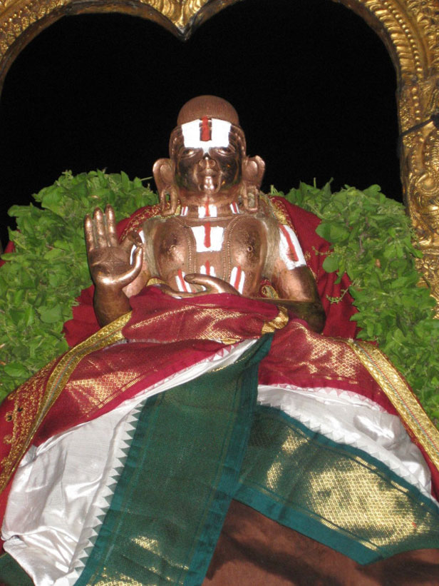He attained Thirunadu on Ruddothkari year (1444), Masi Month, Krishna Paksha Dwadeshi on Thiruvona Nakshtram, Saturday. His ardent disciples carried the eternal body in Pushpa Pallaku and keeping in Padmasana posture and brought it a place in Cauvery River they did the Addakam on the banks of river Cauvery .The place was known as Dwarasan Porpadukai.