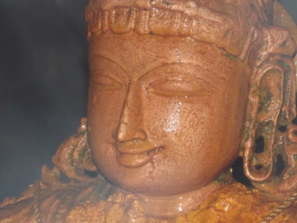 The depth of his worship is seen in that with his fingernails he has carved on the rocky wall of the prison the form of Lord Rama, Sita, Lakshmana and Hanuman.
