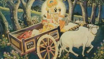 The banks of cauvery was too hot to walk . Swamy Ramanuja knowing about Acharyar’s coming rushes to welcome him at the banks of cauvery with his disciples at the dry river bed . Due to the scorching heat the sand was very hot . Swamy Ramanuja looking at his Acharyar just falls at his lotus feet like an uprooted tree unmindful even in the burning sand . The Acharyar does not respond asking him to raise up The scene is watched by all his disciples