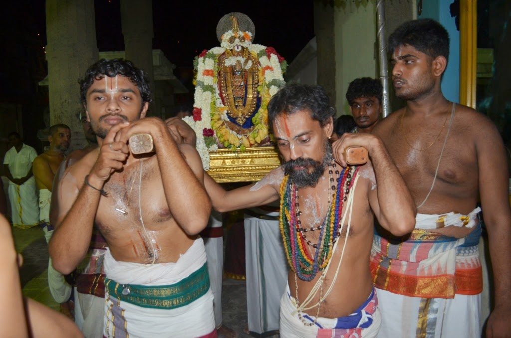 Later, saatrumarai goshti is done at Udayavar (Ramanujar’s )sannidhi in the early hours. At about 7 A.M. the next day, Perumal reluctantly leaves thayar and goes back on Goratham.