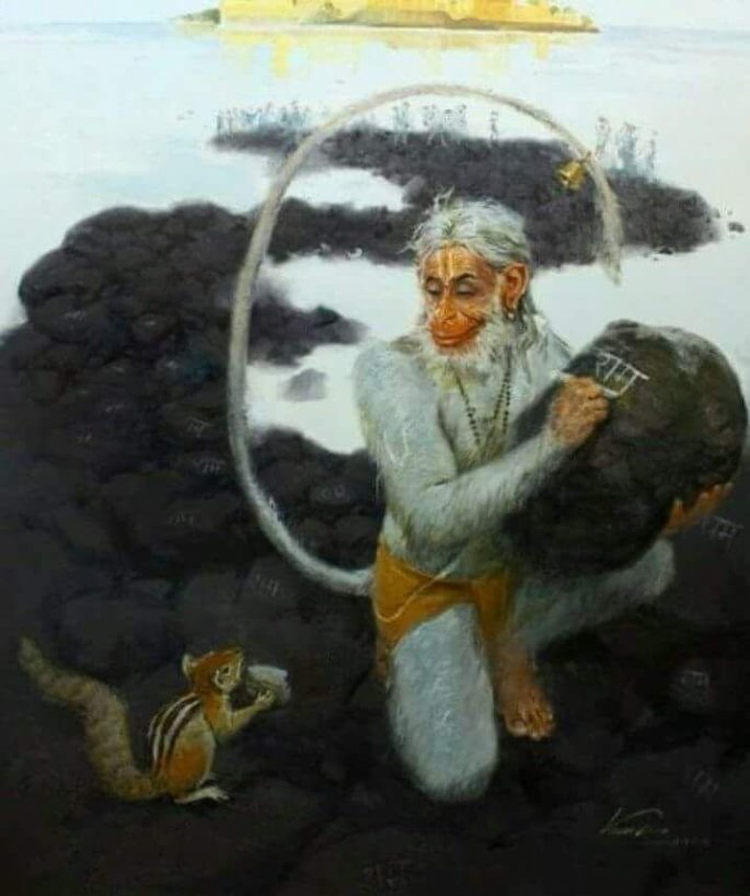 Few squirrels carried bits of wood ,pebbles and sand out of devotion.They were in the opinion that the pathway on which Lord Rama would walk would be soft due to the sand .