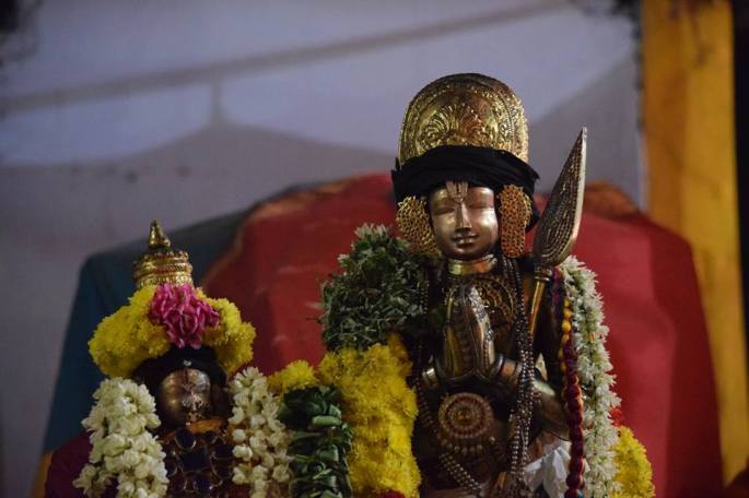 Thirumangai Azhwar and Kumudavalli Thayar. It is very interesting to note that Azwar is never separated from Thayar except on one occasion i.e. during THIRUVEDUPURI UTSAVAM celebrated during Panguni Uthiram day every year in April. Only during this occasion, Azhwar leaves Kumudavalli Thayar alone for a span of 3-4 hours as he goes to rob Perumal’s properties and eventually transforms to become HIS only property .