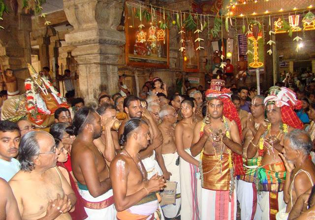 With the temple elephant (Andal) leading the way followed by the vedic pundits reciting dhivya prabhandha goshti LORD enters the temple and walks towards the sanctorium (sannidhi) of Goddess (Thayar) after literally moving around for three hours around the prakarams.