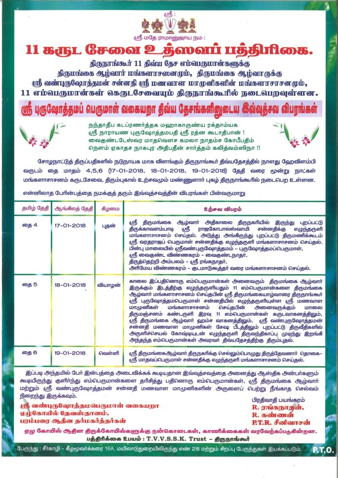 Offering countless obeisances to Asmath Acharyar, Sri Sri Mudaliandan Swamy and all spiritual masters , Adiyen wishes to share our travel and darisanam experiences at Thirunangoor done few years back . We had attended this great festival twice and wish to share the divine experiences to all the devotees .