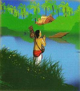 He used to stand at the southern bank of river Kaveri facing the temple and used to glorify the Supreme Lord singing on his veenai . This was going on for a long time.
