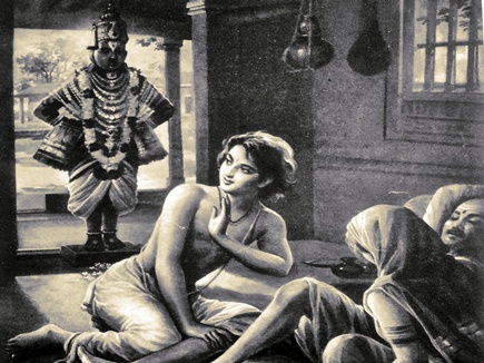 Namadev’s wife who was concerned for the delay , walked along with the lunch to Gopalapur. She requested her husband Namadeva that he should have his lunch as it was getting late . But Namadevar was in a different mood completely .His thoughts were filled with Lord Vittala .