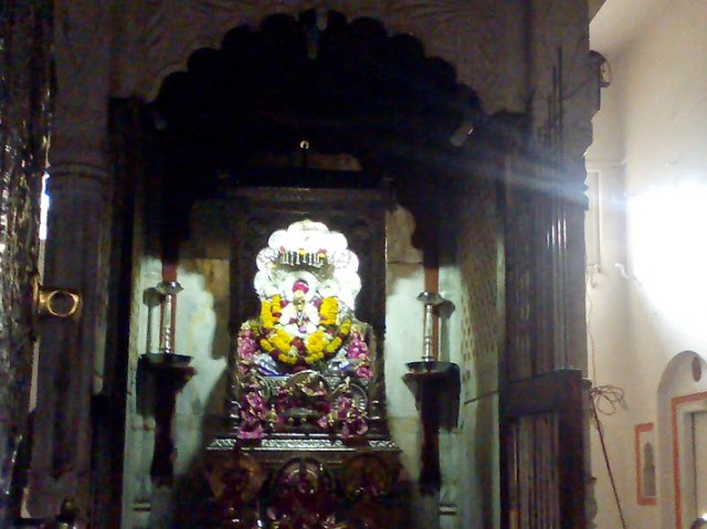 - Alandi:- samadhi mandir of the most renowned Maharashtrain saint ,Sant Jnaneswar Maharaj is about 22 kms north of In the huge temple complex, we can have darshan of the samadhis of Jnaneswar Maharaj, buffalo, the rare tree known as “Ajanavruksh” under which he took Samadhi, the banyan tree which Jnaneswar’s mother used to circumbulate 1008 times daily, the palanquin on which Jnaneswar’s padhukas are placed which is used by the varkaris for going to Pandirpur for Aashada Ekadasi, the beautiful vigrahams of Rakumayi-Pandurangan, Muktabai sannidhi, Siddheshwar sannidhi. Devotees sit in the big hall outside the Samadhi mandir and keep on reciting Bhaavartha Deepika.