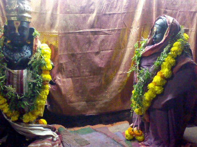 In front of the Samadhi, on the left side, we find a beautiful picture of Gorakumbar singing in ecstasy while stamping the clay and his child clinging to his feet. Opposite to him, we find Gorakumbar’s wife. Inside the altar , we find the Samadhi of Gorakumbar with a copper head being worshipped and images of Pandurangan,Rakumayi.