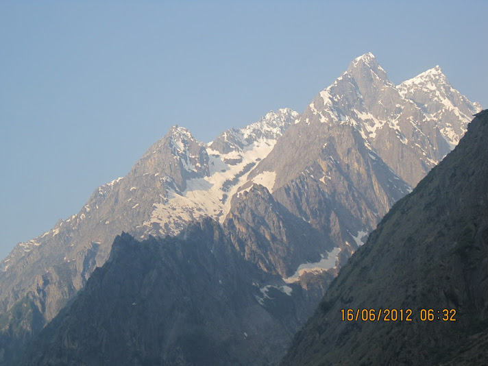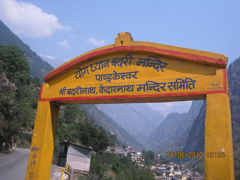 From right, we can find Chamundi,Kubera,Udhavar, Badri Narayanana, Narasimhar in the centre, on the left is Garudar, Lakshmana, Rama , Sita . Lakshmana and Goddess Sita are in white whereas the thirumeni of Lord Rama is in black(shyamaa sundaran). The utsava murthi is Narasimhar Hanumar. During winter, when the main shrine at Badri Vishal remains closed for 6 months, the utsava murthi is brought down to this temple. This temple remains open all through the year. We then visited Vasudevar sannidhi who is believed to be the divya desa Perumal. Lord Vasudevar is in Nindra Thirukolam (Standing posture) holding Lotus and Gadam in HIS upper right and left hands and sankhu and chakram in HIS lower hands. There are also sannidhis for Sankarshana, Shiva, asthabhuja Ganesh, Kali and Bharivan around the temple. We were happy to note that one of the pasurams from naalayira divya prabhandham about this divya desam is written in Tamil and hung at the temple entrance. While we were coming out, we happened to have darshan of one of the Shankaracharyars appointed by Adi Sankaracharyar to take care of these temples. WE checked into GMVNL guest house at Main Bazar and fortunately this time we were provided a better accommodation. Thanking Perumal for allowing us to have HIS darshan at 5 places in Badri kshetram, we retired for the night. ON 17th we checked out by 7 .A.M. and drove to Saldhar which is about 19 kms from Joshirmutt. The weather was pleasant and chilly and we were reminded of Tirumala ghat road.. We saw an arc mentioned as Tapovan. This is a serene place for meditation. Driving ahead, we reached the starting point of our trekking. Bhavishya Badri is located in Subhain village and one has to trek the hill for 6 kms in a lonely path . We just found a small arch mentioning Bhavishya Badri.