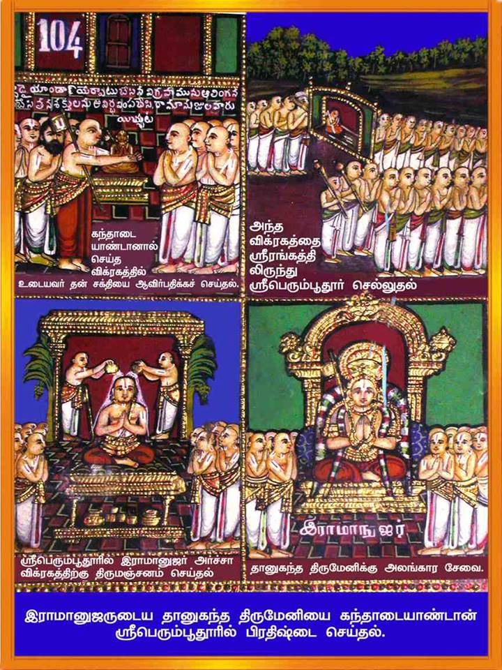 Swami Kandadai Andan pleased his Acharyar Swamy Ramanuja and sought his permission to install an idol replica of him at his appearance place (Sriperumbudur) for the benefit of all the future generation.