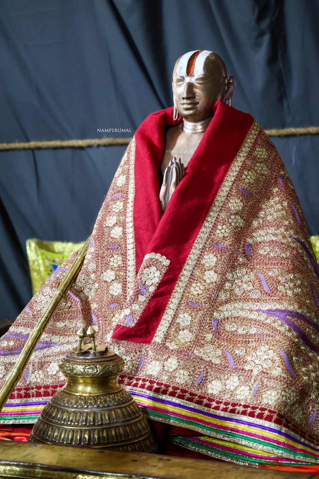 Swamy Ramanujar granted his disciple request. At once Andan summoned a sculptor and advised him to make a replica of his Acharyar “Swamy Ramanujar” in his then advanced age. He invited Acharyar to grace the thirumeni of Swamy Ramanujar . Swamy Ramanujar was pleased with his devotion and embraced the deity . Placing all his grace and all the mercy in that idol, he told Andan to install it on the day of Guru Pushyam.