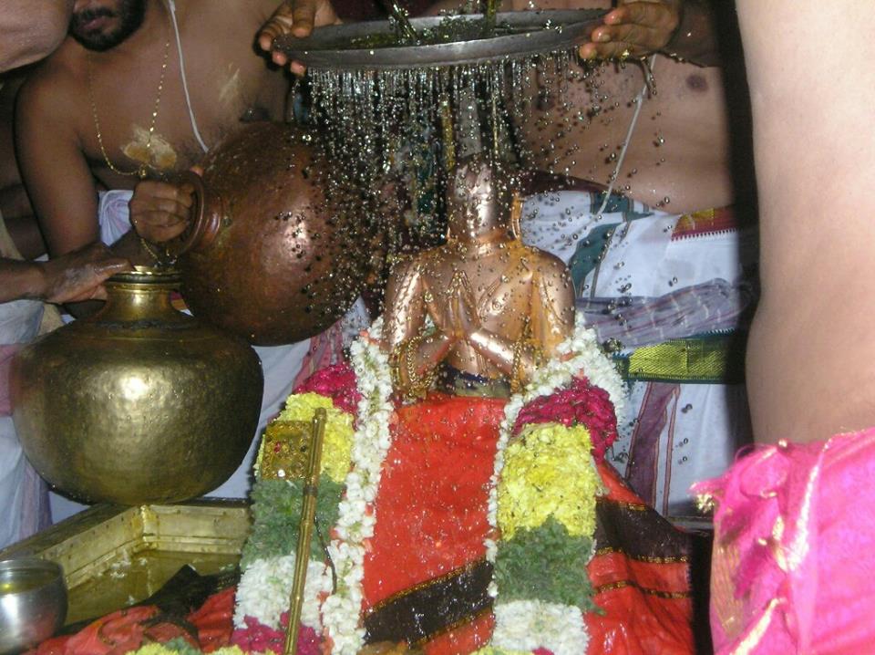 On the banks of the canal, Azhwar does mangalasaasanam to his Acharyar , Sri Naraiyur Nambi Perumal (Naachiyar kovil, Kumbakonam) who personally initiated him into Vaishnavism and mangalasaasanam to his favourite Perumal, Sri Ranganathar . The Divyaprabhanda pasurams takes you literally to the divyadesam along with Azhwar .An interesting happening takes place .The Priests along with bhgavathas stood in knee deep water reciting pasurams on LORD Thirunaraiyur Nambi and Sri Ranganathar. Our Azhwar takes a quick dip in the canal . Along with the Azhwar, all the devotees also had a holy dip.One devotee informed that Azhwar, when he was the chief ,he used to have bath in these waters for refreshing himself after he returned from his looting expedition. Hence, the old practice of having holy dip in the Manikarnikai waters is still followed even today. Azhwar is now honoured with garlands and peethambarams which were adorned by the two Perumals of the divya desams previously. These gifts are specially brought from Kumbakonam and Srirangam with due temple honours. Now our Azhwar proceeds to a nearby old mandapam well decorated for Manjal Neeratam....Thirumanjanam ( Abhiskekam) was performed to SINDANAIKU INIYAN ( one who is sweet for contemplating ) who accompanies Azhwar during the entire procession ( deities worshipped by Thirumangai Azhwar himself),Thirumangai Azhwar and Kumudavalli Thayar. It is very interesting to note that Azwar is never separated from Thayar except on one occasion i.e. during THIRUVEDUPURI UTSAVAM celebrated during Panguni Uthiram day every year in April. Only during this occasion, Azhwar leaves Kumudavalli Thayar alone for a span of 3-4 hours as he goes to rob Perumal’s properties and eventually transforms to become HIS only property .We are now in the Mandapam premises . A sahsradhaara plate where the Azhwar deities are honoured with a holy bath . The beauty is during Abhishekam ( Thiurmanjanam) to Lord Sindanaiku Iniyan the remnants holy water / milk/ honey /curd flows through the Sahasradhaaram on Thirumangai Azhwar and Kumudavalli’s who are underneath LORDS LOTUS FEET. Its a great bhagyam to have darisanam of Azhwar when the holy water of his deities is allowed to bathe the divine couple who have showed us the path of surrender to our only LORD SRIMAN NARAYANA.