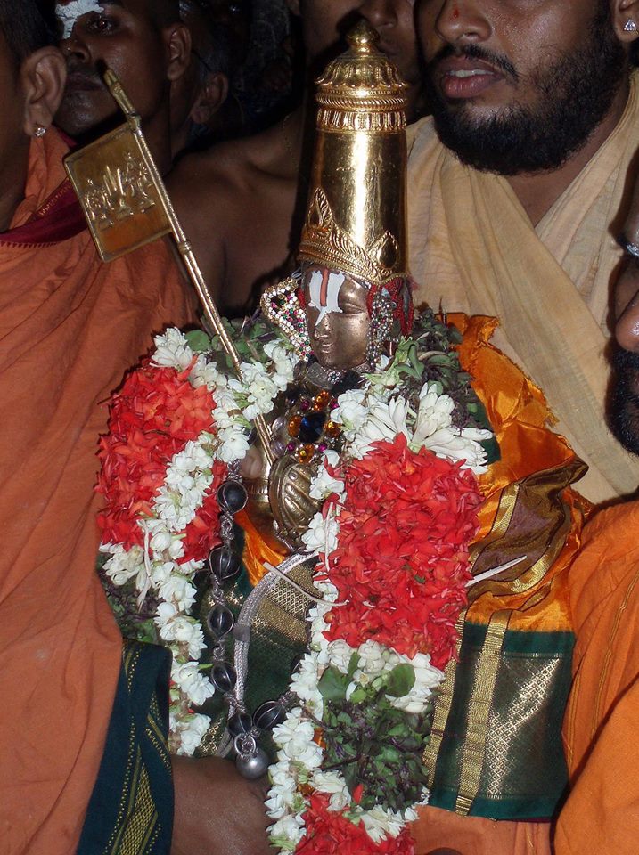 https://www.youtube.com/watchv=NtXbiYGBi08&index=31&list=PL28444E81CFBBC177Adiyen was keen to join the procession amongst many many senior devotees and the excitement in following Azhwar . Un mindful adiyen took a shower near a bore well and quickly changed my clothes and applying Urdhvapundram ran behind the crowd to be as close to Azhwar and the devoted priests . It was totally dark with few street lights which were going ON and Off and sad that there were no proper roads. Unmindful of the thorns and stones, all the bhagavathas were literally running behind the Azhwar as some one is waiting for us .
