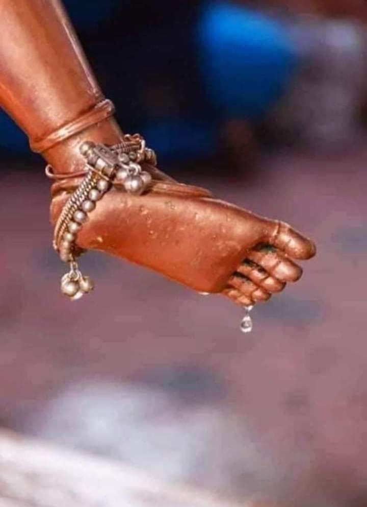 Gora Kumbar , a potter by profession lived in Teri village in Osmanabad district along with his wife Tulasi and child-Hari. He used to be so immersed in bhakti that he would not know what was happening around . Once it so happened that his wife went outside to fetch some ghee for the infant and left the child in Gorakumbar’s custody. While stamping the clay for uniform consistency to make pots, dark clouds formed in the sky seeing which Gora Kumbar was lost in Krishna’s beauty and was singing in ecstasy. The lighting and the downpour startled the little child who crawled and clasped Gora kumbar’s feet. While mixing the clay with his feet, Gora Kumbar was completely lost in Lord’s thoughts with his hands raised above his head and was visualizing Vittal everywhere. Unknowingly, the child got caught in between his legs and in due course was crushed to death. Gorakumbar’s wife who returned after the rain subsided was searching for the child and to her dismay saw the remains of the child mixed in the clay. She shouted at Gorakumbar and brought him to senses. Angered by the thought that because of Lord Pandurangan, her husband was lost in devotion, she proceeded to hit Vittalan. Gorakumbar attacked his wife to stop her from doing apachaaram and was about to hit her. To save herself, she proclaimed promise on Vittalan that he should not touch her. Gorakumbar refrained from this act and tried to pacify her .