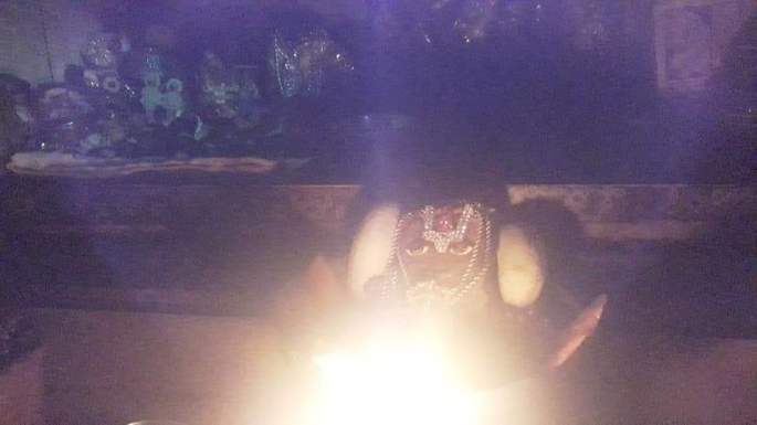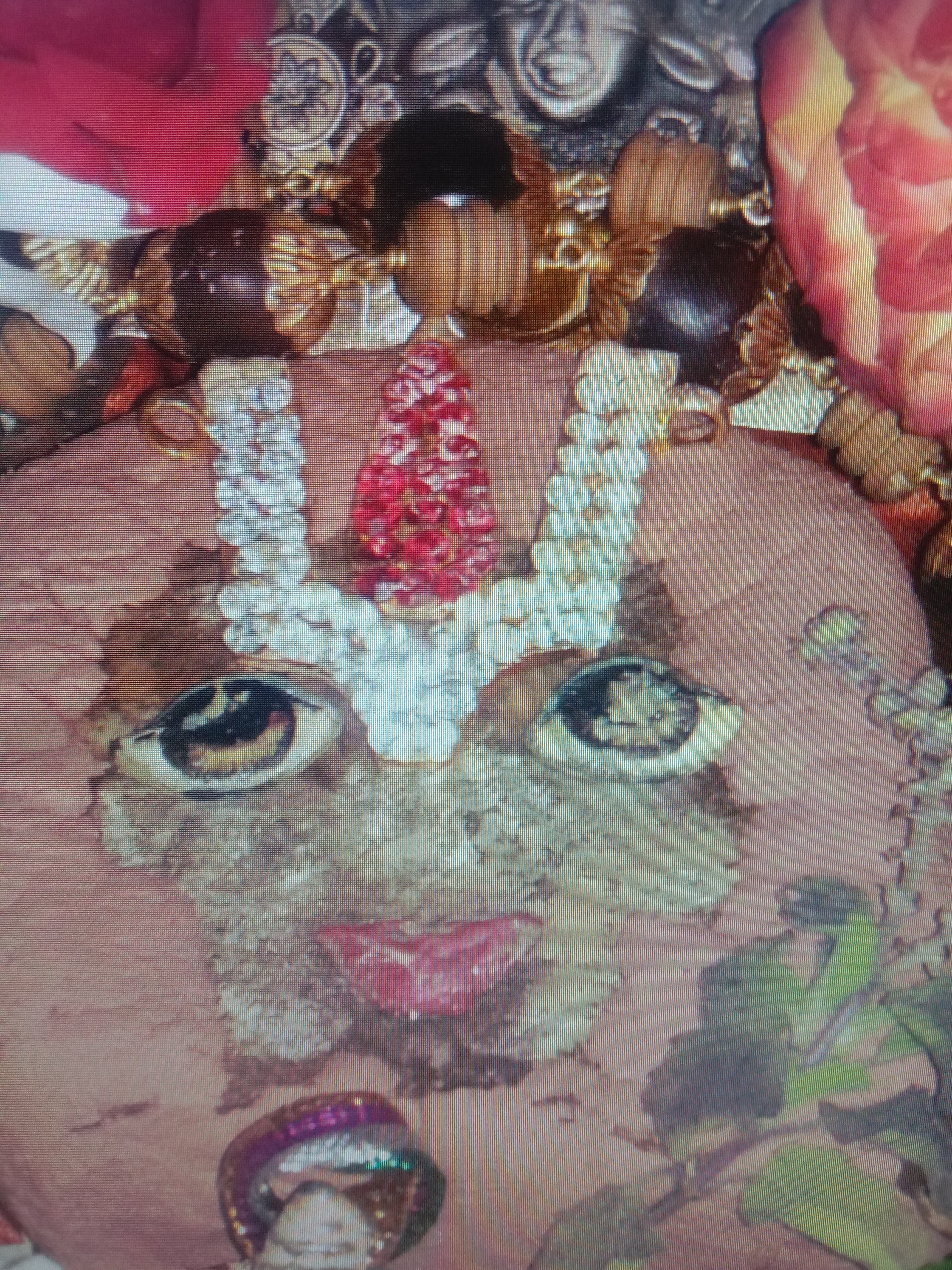 In front of the Samadhi, on the left side, we find a beautiful picture of Gorakumbar singing in ecstasy while stamping the clay and his child clinging to his feet. Opposite to him, we find Gorakumbar’s wife. Inside the altar , we find the Samadhi of Gorakumbar with a copper head being worshipped and images of Pandurangan,Rakumayi.GORA KUMBAR ENGROSSED IN KIRTAN WHILE HIS INFANT SON IS CLINGING TO HIS FEET